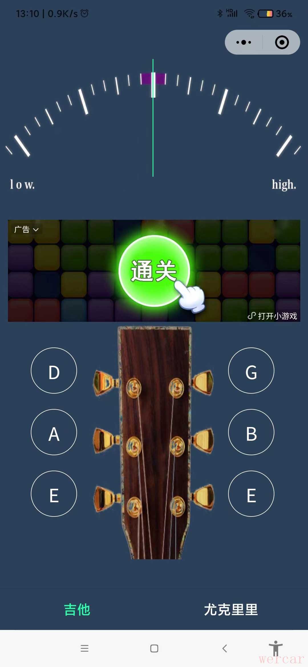 1、界面简洁:打开小程序后,上面部分是一个频率高低表,下面部分是一琴弦选择,中间有一个小广告展示位(不是弹窗广告,不会影响使用)。程序只有两种乐器的调音功能:吉他和尤克里里。