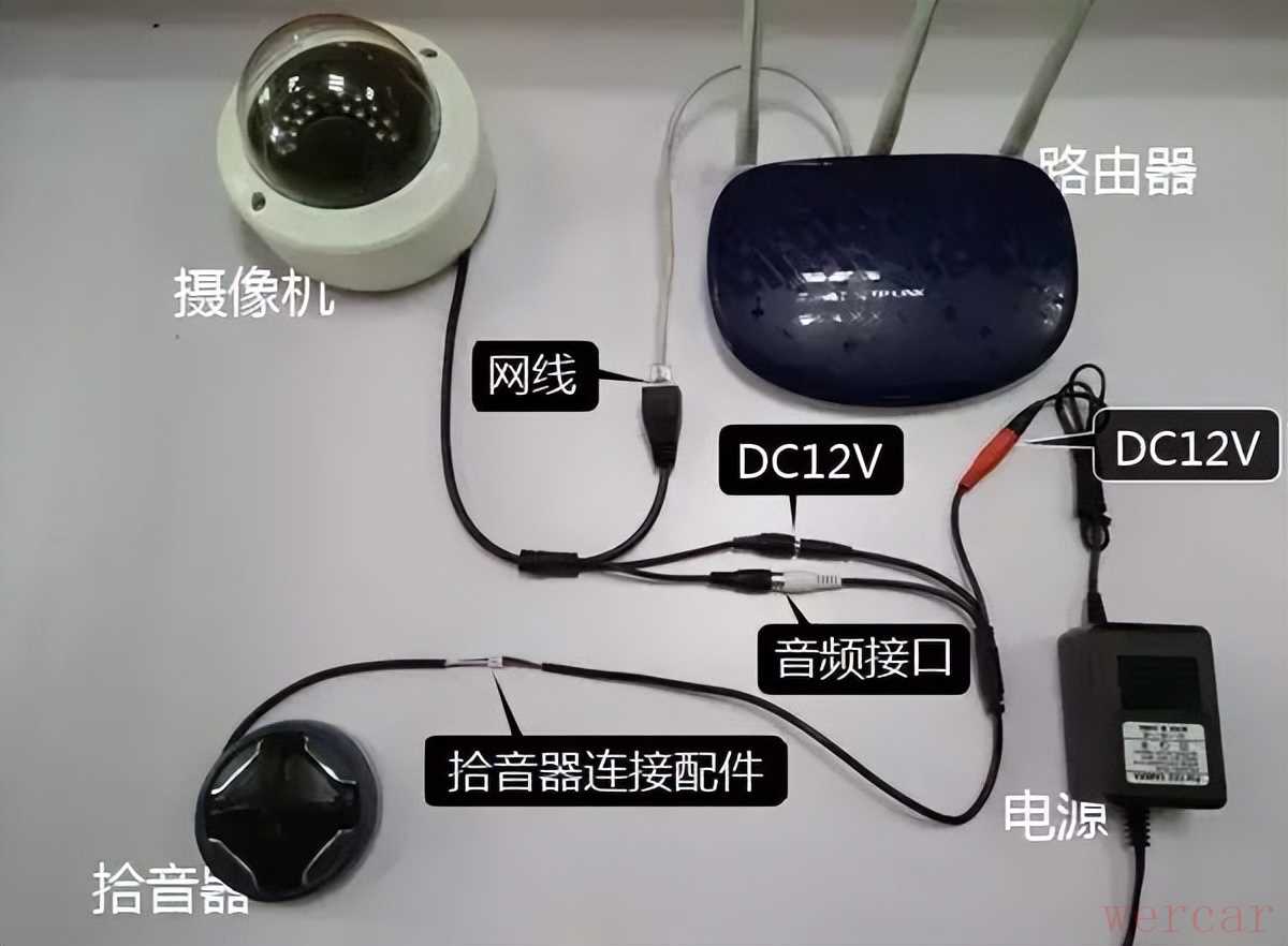 工具:拾音器、3.5mm音频头、12V直流电源、网络摄像机