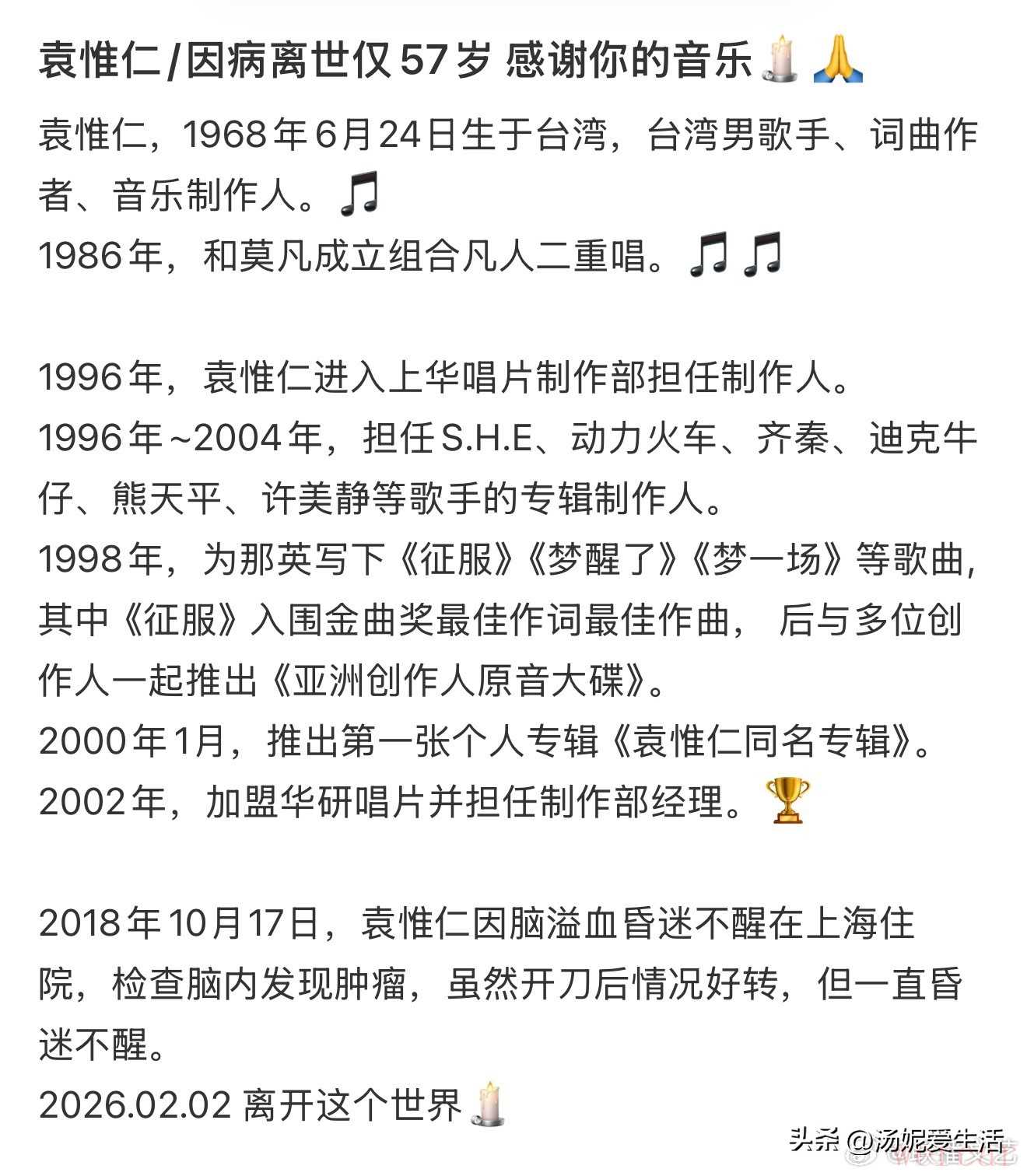 2026年2月2日,台东的风带走了那个弹吉他的“小胖老师”。袁惟仁在沉寂八年后平静离世,终年57岁。家属一句“走得平静,从此自由”,道尽八年病痛的煎熬,也让华语乐坛为一位黄金时代的匠人,奏响了最绵长的安魂曲。当《征服》的旋律在朋友圈再度刷屏,我们悼念的不仅是一位音乐人,更是那个用旋律定义都市情感的年代。
