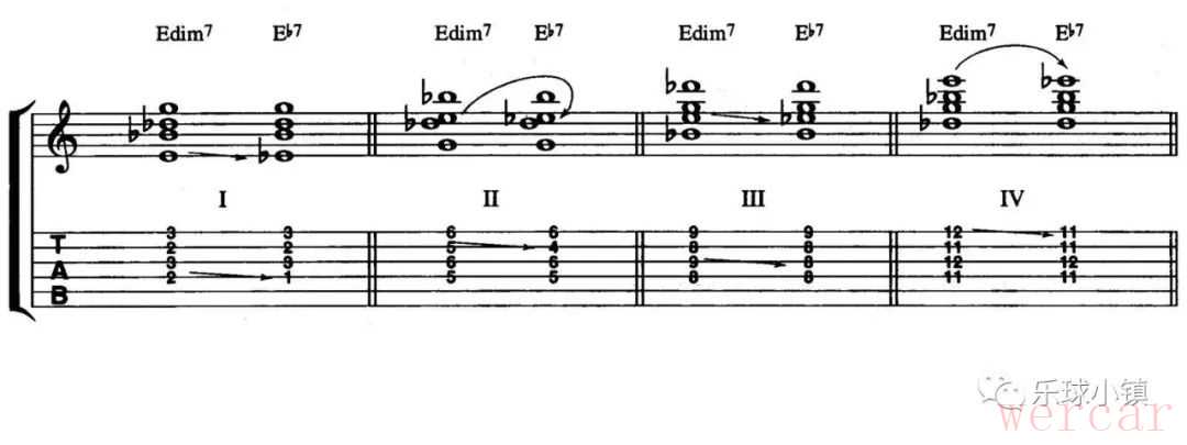 例三在例一中我们已经了解了减七和弦的几种转位形式,下面我们将看到其他种类的七和弦是如何从减七和弦形式中衍生出来的。我们将Edim7和弦的根音降低半音到E♭,这个音就成为E♭7和弦的根音。下图展示了和弦所有的4个转位的情况。E音到Eb音的移动在谱例和TAB图表上用箭头表示。