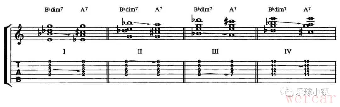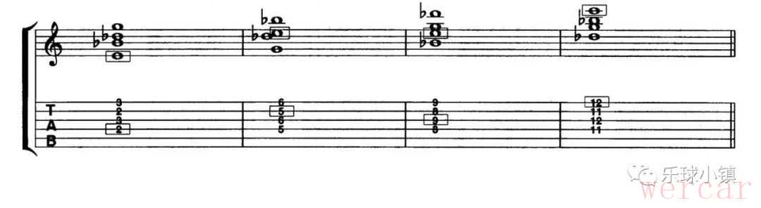 我们可以将减七和弦形式称作为 "自动循环重复",因为减七和弦都是由小三度构成,转位后和弦结构仍然保持不变,依然是三个小三度构成。这样使得减七和弦在同一根琴弦上每四品就会对称地重复一次,如谱例一。因此,与吉他上其他的和弦声部不同,你不需要学习许多不同的指法来覆盖整个指板。