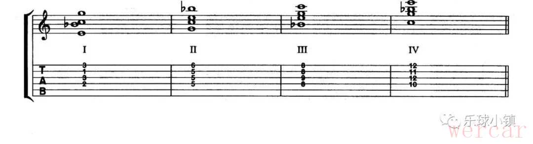 例二下图的例子展示了C7和弦在4-3-2-1琴弦组上的4种声部方式。请记住,谱例中的罗马数字并没有按照标准使用 "转位 "一词。传统意义上来讲,和弦转位的正确顺序是:根音位置(原位,根音在底部),第一转位(三音在底部),第二转位(五音在底部),第三转位(七音在底部)。文中所标记的罗马数字指的是在同一根琴弦上的数字顺序逻辑的低音位置。因此,第一个和弦被命名为C7的第一转位,因为在四弦上E音是这组和弦中的最低音。其他和弦也是如此,将被称为和弦的第二、第三和第四转位,用罗马数字表示。