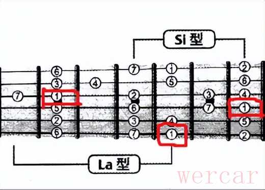 比如,三弦有1(do)。根据la品三弦有1(do)的道理,我们能联想出此时我们正在六弦的la品(五品)里演奏,用我们之前介绍的方法联想出la品六至一弦的音分别是:625136。那么附近的si品(七品)六至一弦的音分别是7362b57。do品(八品)六五二一弦的音分别是:1451。这样通过一个1(do)音,可以快速反映出我们现在正在la音阶指型里弹奏,很快速便捷。