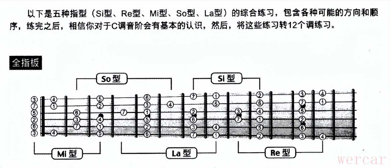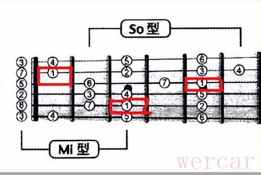 (应用的是mi音阶指型和sol音阶指型,1的分布特点;根音1在sol品5弦,高八度的冠音1 在它左下方的fa品2弦和在它右下方的la品3弦的位置,而且fa品2弦的1与la品3弦的1为音高相等的同度音)通过sol品五弦的1,可以把mi音阶指型和sol音阶指型连接起来,扩大演奏区域。