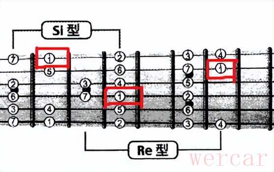 (应用的是la音阶指型和si音阶指型,1的分布特点;根音1在do品6弦,高八度的冠音1 在它左下方的la品3弦和在它右下方的re品4弦的位置,而且la品3弦的1与re品4弦1的为音高相等的同度音)通过do品六弦的1,可以把la音阶指型和si音阶指型连接起来,扩大演奏区域。