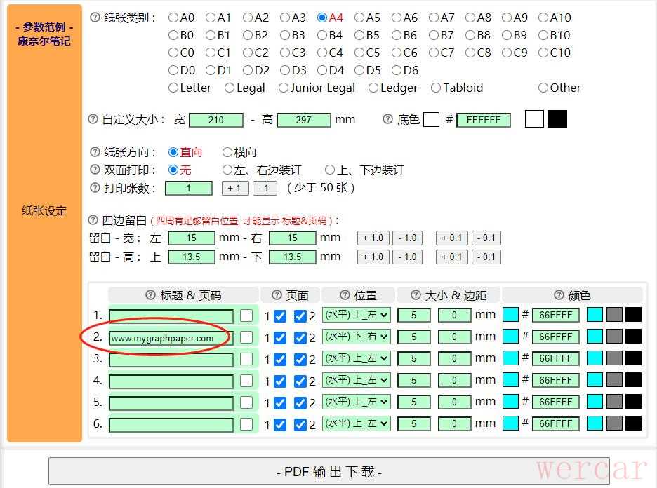 要注意的是,在预设状况下印出的格纸会有网站水印,在纸张设定上的标签页码区块中把它移除!
