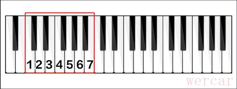 键盘上有若干个如图一红框所示的区域,该区域内一共有7个白键和5个黑键,音名按顺序排列,分别是:1、#1(b2)、2、#2(b3)、3、4、#4(b5)、5、#5(b6)、6、#6(b7)、7。7个白键的唱名分别是:do、re、mi、fa、so、la、si由于是入门阶段,不会涉及到黑键,所以“黑键的唱名”将放到下一阶段进行讨论。