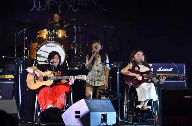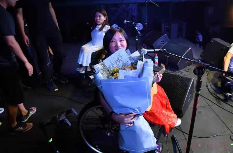 坐在轮椅上的主唱崔莹,身体随着节奏左右摇摆。怀里抱着的吉他和她娇小的身躯形成鲜明对比,样子像是一个小孩抱着与自己个头极不相称的大玩具。她的鞋子白得耀眼,连鞋底也没有一点污渍,随着音乐节拍一踮一踮。