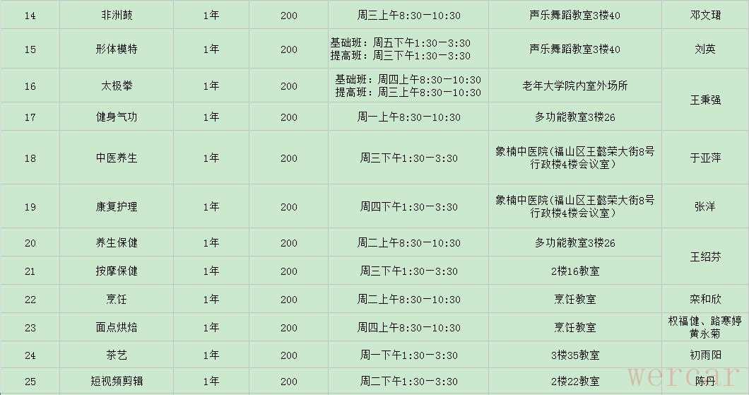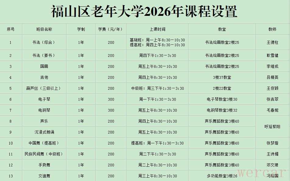 福山区老年大学创建于1989年,近年来,在区委区政府的高度重视和大力支持下,老年大学学习活动场所建设水平不断提升,教学质量不断提高,目前场所面积达到5000平方米,拥有现代化教室15间,同时配备了图书室、健身室、台球室等活动和功能室70余间,为广大老年朋友老有所学、老有所乐、老有所为提供了更加舒适、温馨的学习环境。近年来组织的活动、推荐的课程、作品等多次荣获省市各级奖励,先后被评为山东省首批老年大学示范校、省级规范化示范校等荣誉称号。一、报名条件 1.自觉遵守学校规章制度。2.年龄原则上为50周岁以上(1976年12月31日前出生),原则上不超过80周岁。其中,舞蹈专业不超过70周岁。3.身心健康,无传染性疾病和精神性疾病,具有完全行为能力,能自主学习,无需家人陪伴。二、课程设置及教师情况1.书法(综合):教师王德柱,长期从事书法的研习和教学工作。区、市书法家协会会员,中国佛教协会书画研究会山东分会副会长。以学习篆隶楷行草五体书法为主,让学员了解和掌握书法的基本知识和技能,包括汉字的笔画、结构、章法和书法史等方面。通过学习,培养良好的书写习惯,提高书写质量和审美能力,领略中华传统文化的魅力。2.书法(篆书):教师耿雪健,福山区书法家协会副主席,福山书画院书法教师,烟台市书法家协会副秘书长,烟台市老年大学书法教师,山东省书法家协会会员。以学习篆书为主,教授分析篆书发展历程,掌握笔法、字法、章法,学习篆书的基本练习动作及运用,让学员们感受到书法艺术的文化底蕴和历史内容。3.国画:教师李维成,现为山东美术家协会会员,擅长山水及花鸟画。山水师从黄宾虹,花鸟直追吴昌硕,具有四十多年国画教授经验。以学习山水、花鸟画为主,系统地教授国画知识。从基础的线条勾勒、色彩运用到复杂的构图和意境表达,带领学员逐步深入探索,让学员在学习过程中感受到国画的博大精深,领略其独特的审美情趣,在笔墨之间展现自我,传承中华传统文化之美。4.吉他:教师吕精英,山东省音乐家协会吉他协会会员、烟台市音乐家协会吉他协会理事、福山区音乐家协会会员,海鸥精英吉他工作室负责人。以轻松愉悦的节奏带领老年学员入门吉他(电吉他/民谣吉他),掌握对应乐器的基础弹奏技巧,能独立弹唱多首经典老歌,帮助丰富晚年文娱生活,收获音乐陪伴的幸福感。5.葫芦丝(中级班,演奏水平需达到三级以上):教师王俊颖,取得中央音乐学院葫芦丝等级10级资格证书,多次随参团队加全国性比赛展演并获奖,从事过青少年、成人葫芦丝教学,并获得民管学会颁发的优秀指导教师荣誉证书。课程主要内容:以李春华《葫芦丝巴乌实用教程》为教材,教授葫芦丝吹奏的基本技巧,学习吹奏葫芦丝独奏曲以及有意义的流行歌曲,让学员感受中国民族乐器的魅力!6.电子琴:教师张吉翠,从事音乐教学工作30多年,并获得“优秀教育工作者”称号。自老年大学成立伊始至今一直从事电子琴教学工作,主教电子琴初级教程、简易电子琴教程等内容。曾在各系统举办的歌咏大赛及学校“六•一儿童节”歌咏大赛中多次担任导演及键盘乐器的伴奏工作。以《简谱电子琴自学入门36技》为教材,供大家轻松学习、快乐演奏。帮助老同志陶冶情操,愉悦心情,丰富精神生活,培养良好的心态,促进健康,益寿延年。7.电钢琴:教师毛春妮,硕士研究生,福山区蓝悦艺校校长,烟台市音乐家协会会员,小肖邦国际钢琴比赛,星海杯钢琴比赛等赛事评委,中国儿促会艺术测评测评官。先后师从意大利钢琴家UGO FEDERICO先生,德国音乐教育家巴斯蒂安女士,美国钢琴演奏博士葛宇轩女士,我国音乐教育家周铭孙,国际青年钢琴演奏家张哲,英皇中英文双语教学总监于海兰女士等学习进修。以学习包括基础乐理知识为主,包含手指技术训练,演奏技术,弹唱以及演奏礼仪等内容。老师讲解指导陪练,学员互相探讨交流,边学边弹,边弹边唱,在愉悦的学习氛围中锻炼大脑,愉悦身心,提升音乐素养。8.声乐:教师呼延紫阳,毕业于西北师大,在兰州市职业技术学院任教之后在甘肃省广电局播音培训中心工作,担任普通话测试员。自2007年开始兼职于兰州市群众文化艺术馆和兰州市老年大学担任合唱和声乐指导老师,在东方诗韵朗诵社担任社长及指导老师。以普及老年人声乐知识,通过理论与实践相结合的教学方式,帮助学员掌握音乐基础知识、学习正确的发声方法,气息运用,运用现场教授,辅助练习的方式,教授基本乐理知识,经典歌曲等。9.沉浸式朗诵:教师呼延紫阳,以提升教授基础知识,技巧练习,情感表达为主,结合各种作品现场指导,学习古诗词,古文,现代诗歌,散文,影视剧经典台词。 10.中国舞(提高班):教师张梦璇,华彩中国舞1-3级考级教师,华彩中国舞4-6级考级教师,舞当家国学舞蹈培训教师,身韵巡礼高级教材培训教师。舞龄十年,擅长中国舞,中国古典舞,剑舞,舞台经验丰富,上课方式生动有趣,有耐心,深受广大学员喜欢!以学习基本功和身韵及中国舞的基础知识为主,包括形体训练,体能训练(软度、力度、平衡、重心、协调性、速度灵巧性及每一关节、每块肌肉和每条韧带进行的训练)古典舞身韵,成品舞蹈。11.民族民间舞(中级班):教师王诗媚,高级舞蹈教师,成人教育中国舞学科教研员,长期进修于北京舞蹈学院。以学习中国民族民间舞为主,教授中国舞基础身