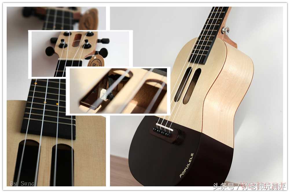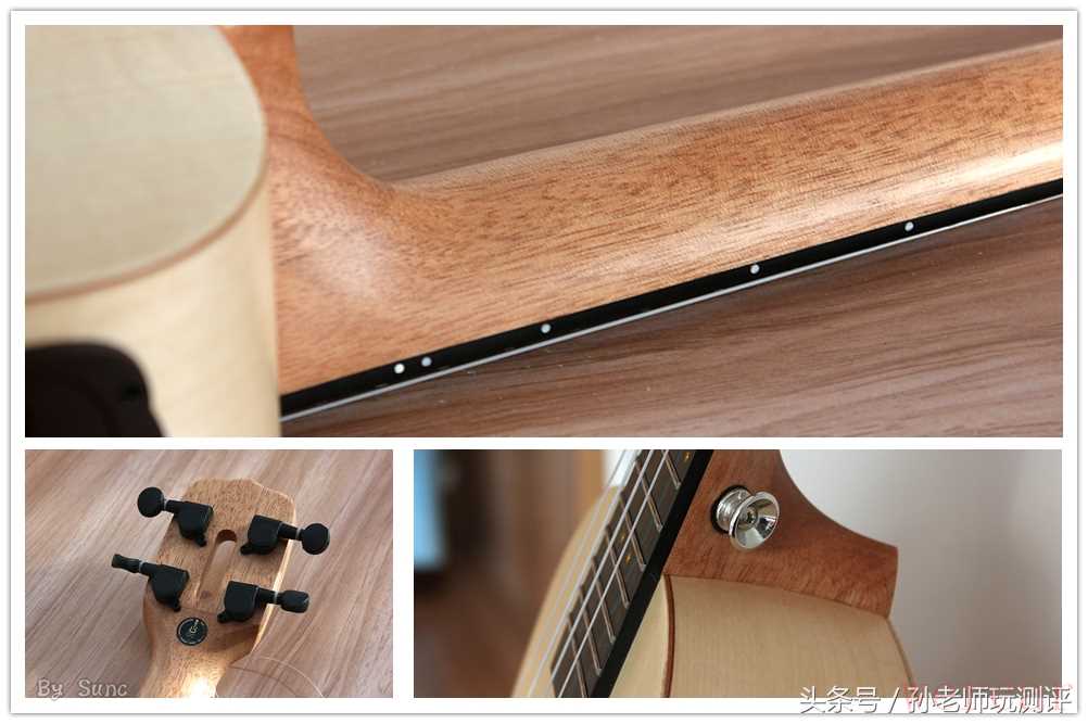 琴颈应该是使用的原木,用的是什么木材就不得而知了,但是打磨的手感,以及弧度的美观度是非常不错的,弦钮的颜色也与共鸣箱体的一致,整体感很好,四个弦钮没有使用金属材质,并没有金属的冰冷感。