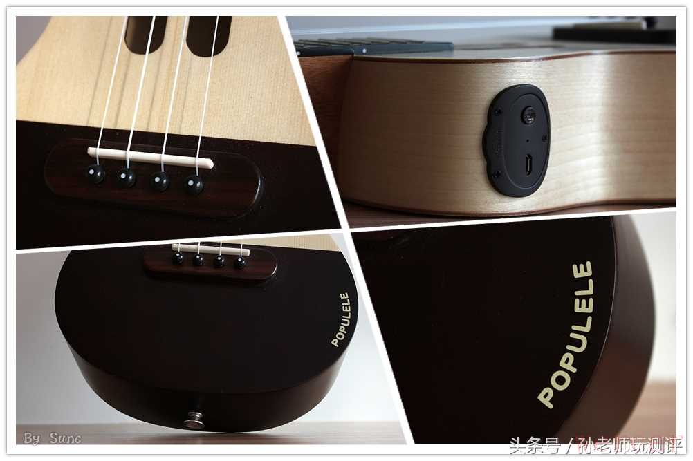由于尺寸的限制,尤克里里的共鸣箱比较小,当然,也正是因为小巧易携带,尤克里里才成为了一件成熟的独特乐器。POPULELE在共鸣箱里还内置了电池(用以给指板LED和蓝牙模块供电),侧板上面是Micro USB充电接口,以及电源开关,长按三秒开关机,短按一下显示电量。如果你是高手,可以完全忽视这个装置,直接用琴来弹奏。在琴尾处还有一个用于固定背带用的挂勾,配合琴颈处的另一个挂勾使用。共鸣箱边缘还印有产品的名称,整体的颜色风格是曲奇饼干式的萌系外形,颜值学是相当的高。共鸣箱的主体材质按官方众筹页面的介绍,面板是A级云杉面板,侧板和底板是进口欧洲枫木。