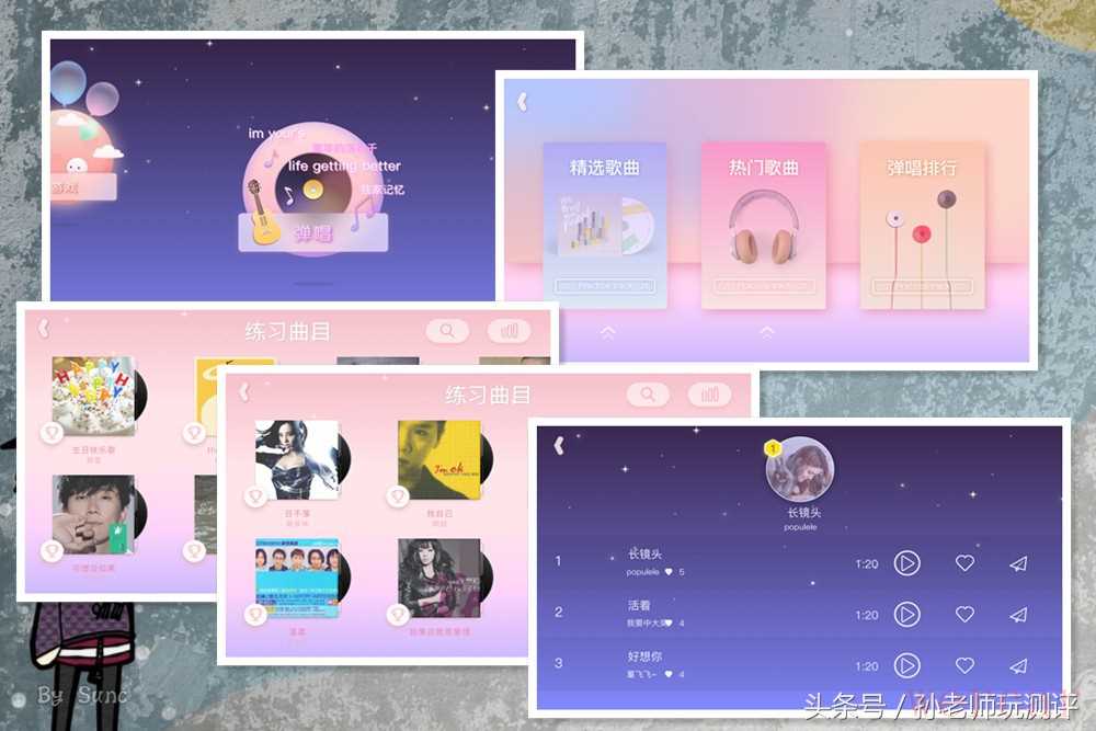 乐曲弹唱这一个功能共分三块:精选歌曲、热门歌曲、弹唱排行。曲目并不是很多,与众筹面页提及的千首曲库距离还有很大的距离,在弹唱乐曲里,使用到的和弦基本在游戏关卡里出现过,如果你已顺利通关了前面7关游戏,弹唱功能更多的是练习右手扫弦的节奏,同时可以练习左右手协调配合的能力。在排行里可以上传弹唱录音,以便与其他琴友交流互动。这个功能有点类似于微信的朋友圈,只是这里出现的都是POPULELE的用户。