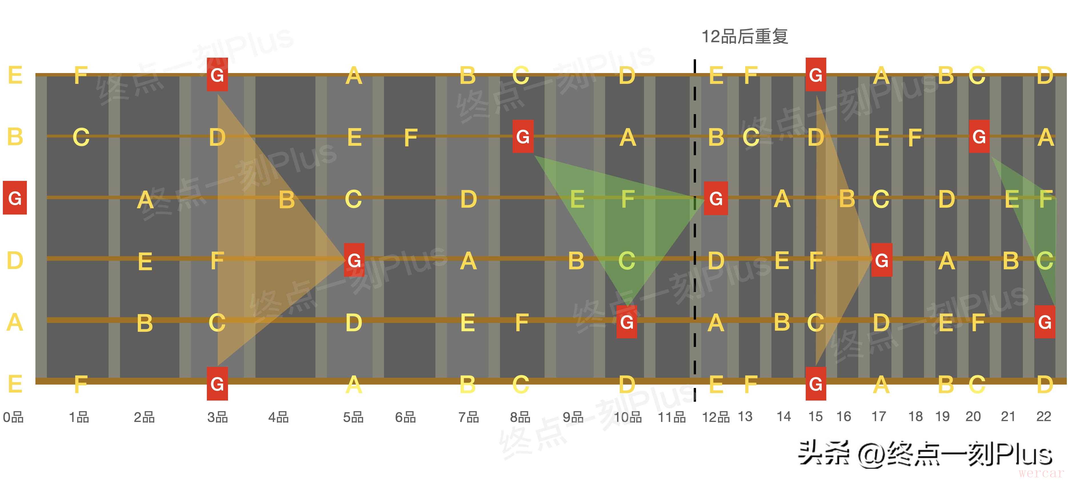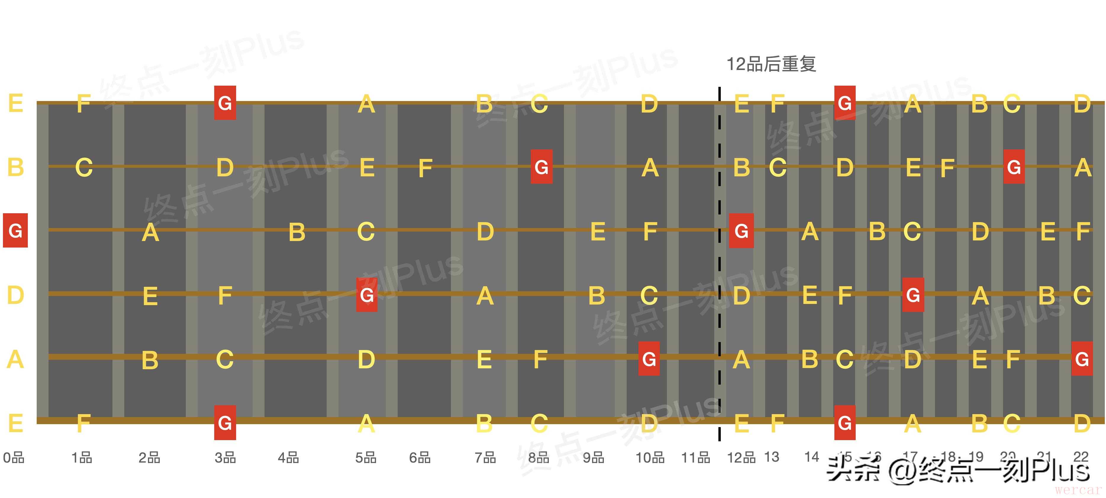 首先,我们来分析下音名CDEFGAB的音程关系。EF和BC是半音关系,转换一下排列顺序可以得到D-EF-G-A-BC,即“以G为中心,左边是D-EF,右边是A-BC”。意味着我们只要在指板上找出所有的G,就能快速识别左右的音名啦!G在指板上的分布如下: