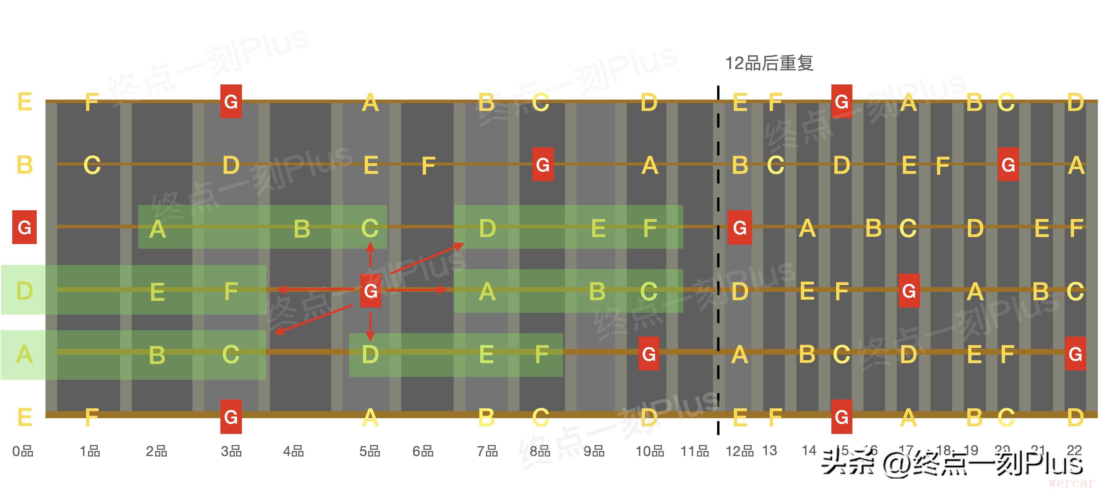 这个“G点”通常指的是 "G大调音阶(G Major Scale)" 在指板上的位置,特别是它 "跨越品格边界" 的方式。
