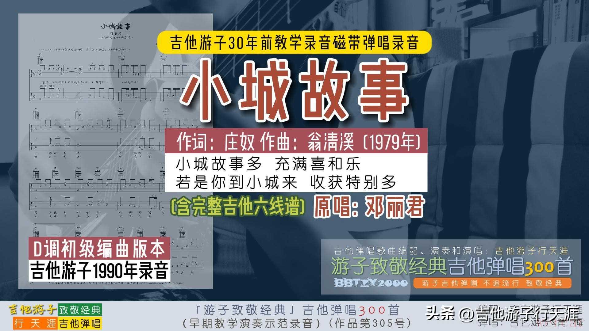 本吉他弹唱歌曲游子已重新编曲,也收录于游子新编的「游子致敬经典-吉他弹唱300首」合集中,以下此首吉他弹唱的示范演奏视频链接:【观看链接】展开游子致敬经典:吉他弹唱邓丽君《小城故事》30年前编配初级弹唱
