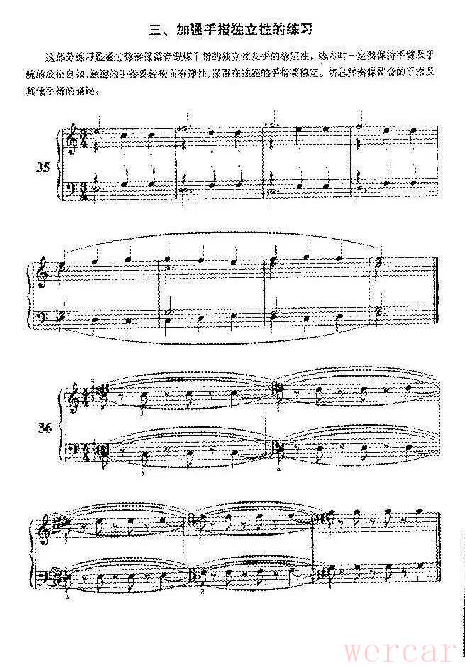 锻炼手指的独立性可以用带有保留音的练习曲进行练习。保留音的练习能帮助训练手指的独立和肌肉的控制、击键的精准度和深度,以及手的稳定。这对增强手指的控制力和稳定性很有好处。
