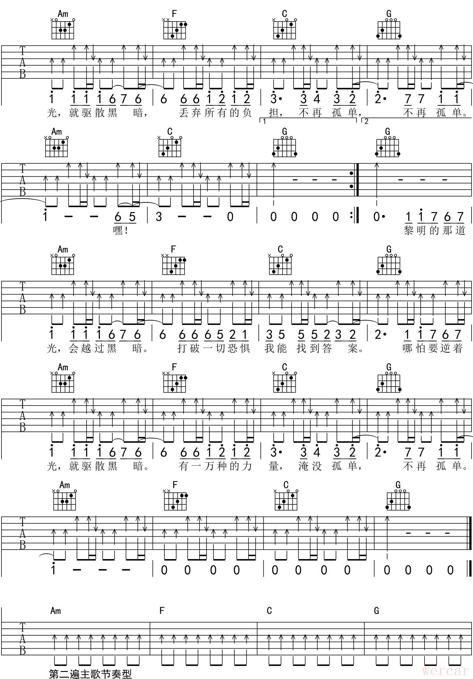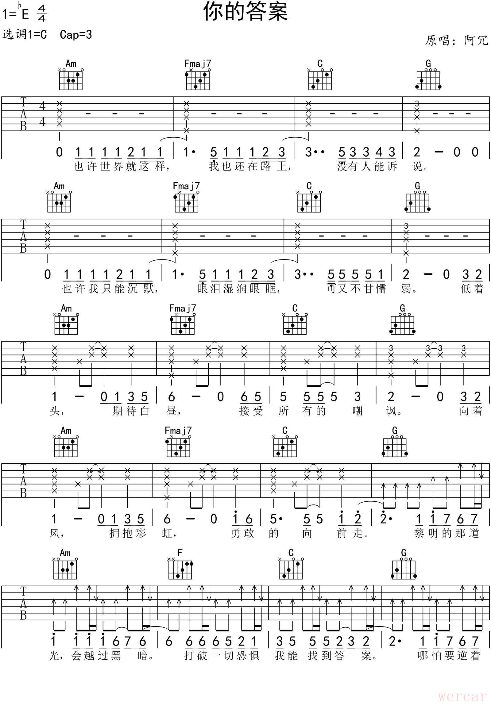 以下是阿冗《你的答案》的民谣吉他二级进阶版(第6课下)吉他谱。这个版本主要运用了C大调的开放和弦,并加入了一些简单的扫弦技巧和分解和弦伴奏,适合有一定基础的吉他手练习。