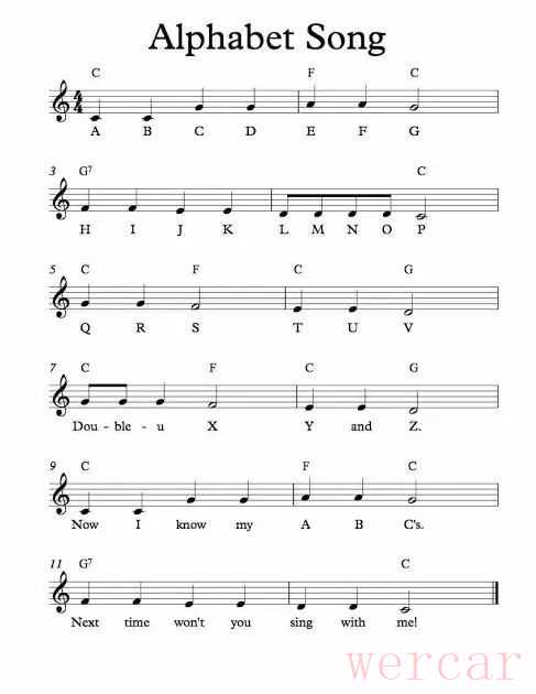 毛毛给小朋友们带来的是一个比较普遍的版本的唱法,歌词相信大家都非常熟悉了,那毛毛就献上这首Alphabet Song的曲谱: