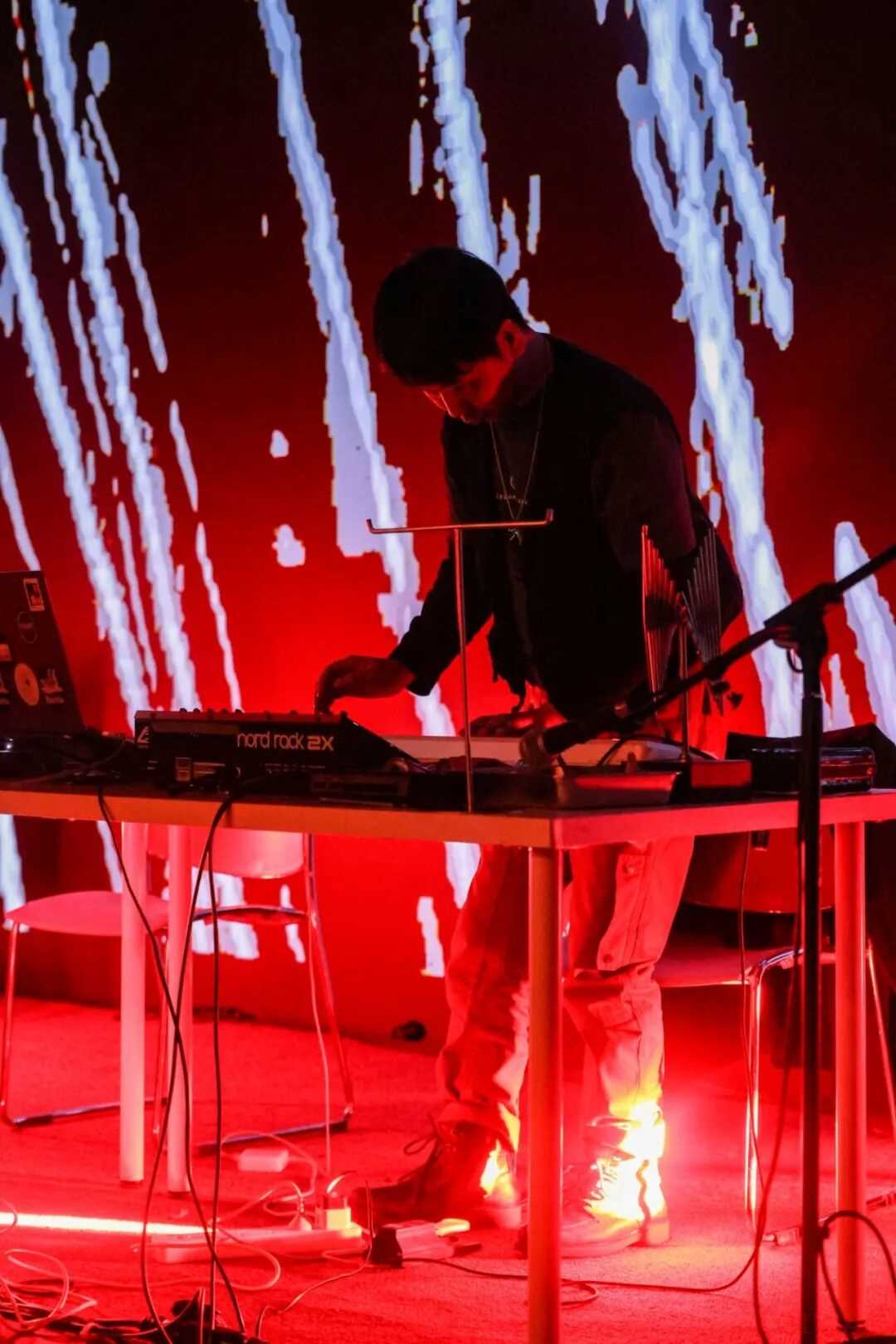 李言增 LI YANZENG 的这部30分钟现场声音作品名为《物理情绪》。他借助模块合成器系统的调制与编程,展现出一种纯粹源于物理本质的声音美学。在噪音、故障、微声和蜂鸣等音色构成的语境中,辅以影像的协同,作品摒弃传统叙事,转而传递由实时空间感知、现场人群状态所激发出的视听情绪诗篇。