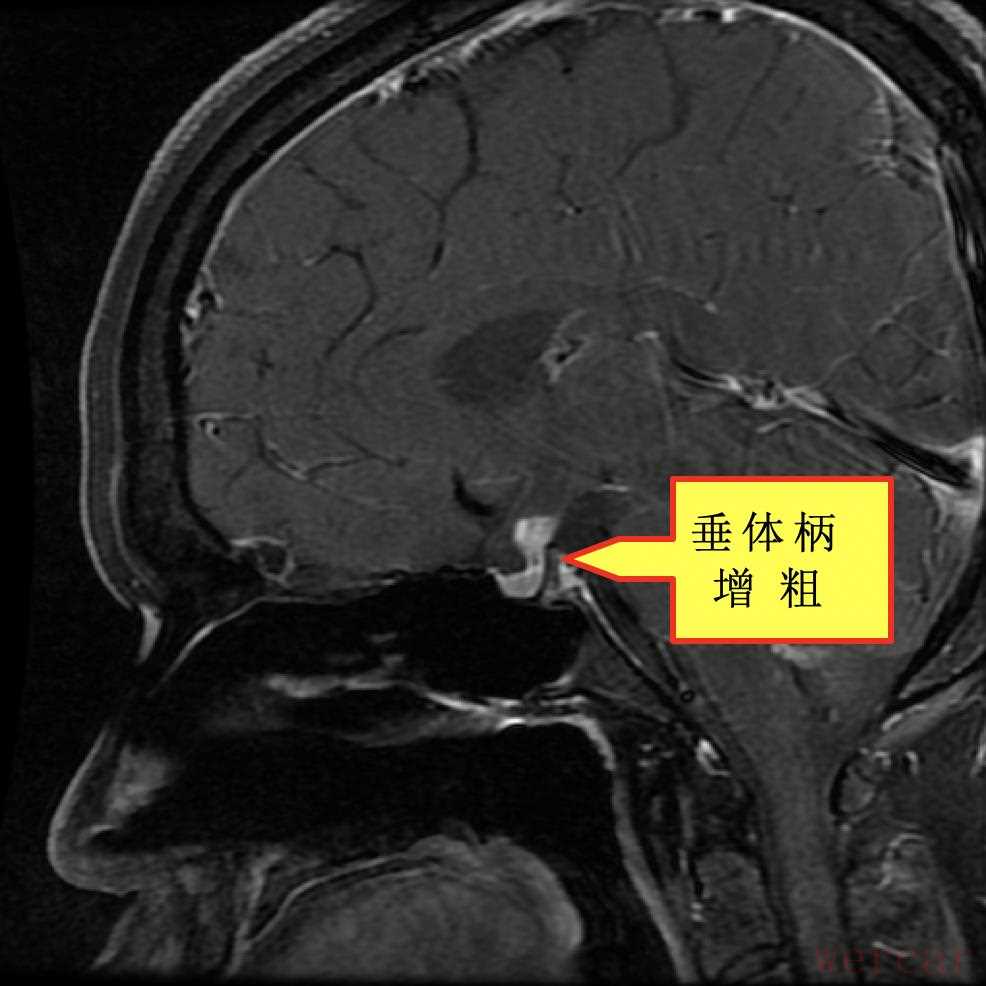 可是,患者在就诊时的2年前(2015年2月),仍有多饮多尿的现象,除此之外还有轻度的干咳。做头颅MRI提示垂体漏斗部增粗,查尿比重为1.000,行性激素检查提示促卵泡生成素、睾酮低。胸片报告未见明显异常。仍建议观察。