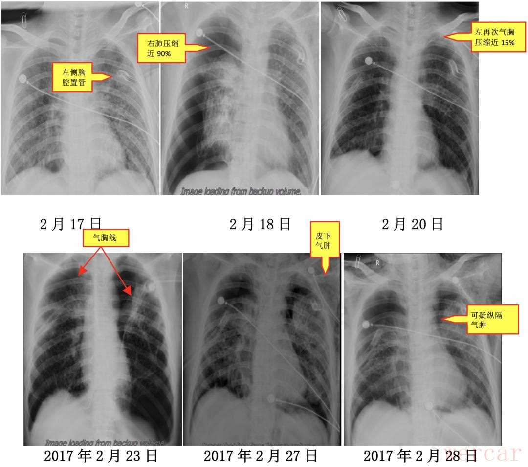 由于该患者病情进展迅速,双肺组织破坏严重,现有的治疗方法疗效均不确切,家属拒绝了肺穿或肺活检进一步确诊,同意于2017年2月14日开始口服强的松30mgQD,并给予抑酸、补钾及保护胃黏膜治疗。患者于2017年2月17日中午,突然出现胸闷、气短、呼吸困难、大汗淋漓,指脉氧饱和度下降至74%,左肺叩诊呈鼓音,听诊左肺呼吸音消失。考虑左侧气胸,行左侧胸腔置管,先后抽出6300ml气体,指脉氧饱和度升至83%,仍可轻松抽出气体。后行左侧胸腔闭式引流术,指脉氧饱和度升至90%,患者气短好转。