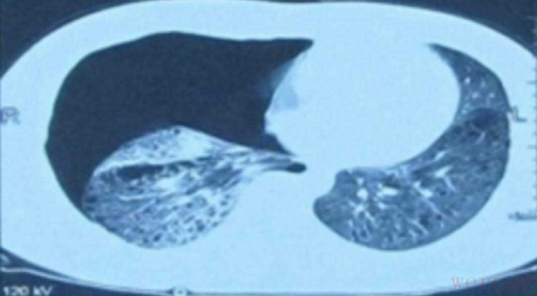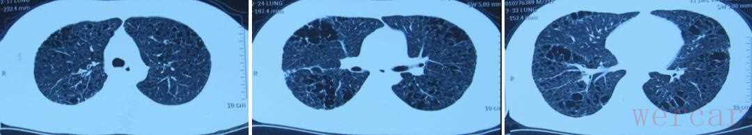 入院后,给予吸氧及「头孢曲松」等治疗。入院后又复查胸部CT:1.两肺弥漫囊性病变(肺外带及下野较为著),部分呈蜂窝样改变,并多发小结节影;2.双侧胸膜增厚、粘连。