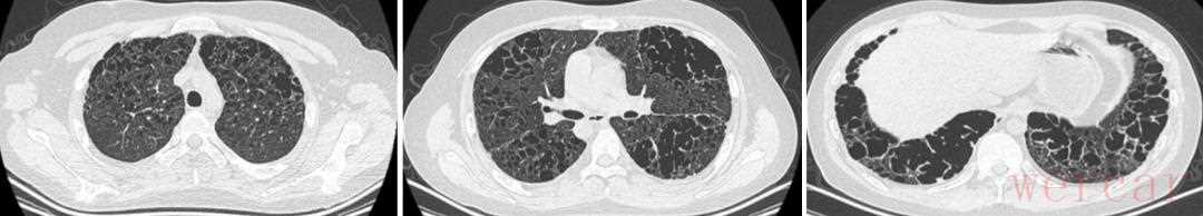 2、淋巴细胞间质性肺炎(lymphocytic interstitial pneumonia,LIP):是一种良性的淋巴细胞增殖性疾病,常合并系统性疾病(艾滋病、EB病毒感染等)或者结缔组织病(干燥综合征、类风湿关节炎、系统性红斑狼疮等),女性好发,胸部CT可表现为薄壁囊泡,多为细支气管、血管旁及胸膜下分布。与其它囊性改变的肺部疾病相比,该病的囊泡较大(最大直径可达 3 cm),并且数量较少。