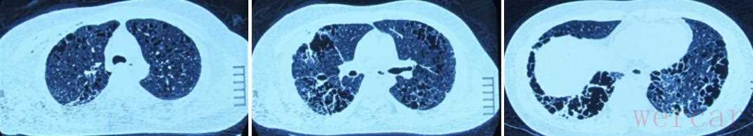 (3)胸部CT(2017年1月11日,常州市某医院):双肺多发肺大泡。