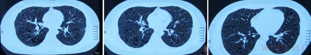 就在患者在就诊时的8个月前(2016年10月),干咳症状开始加重。患者到常州市某院行胸部CT检查,显示两肺呈多发微小结节影,并可见多发类圆形无肺纹理透亮区。医院给予了对症止咳治疗,效果欠佳。患者同时出现头皮瘙痒,诊断为脂溢性皮炎,外用药物治疗,效果良好,皮炎完全缓解。