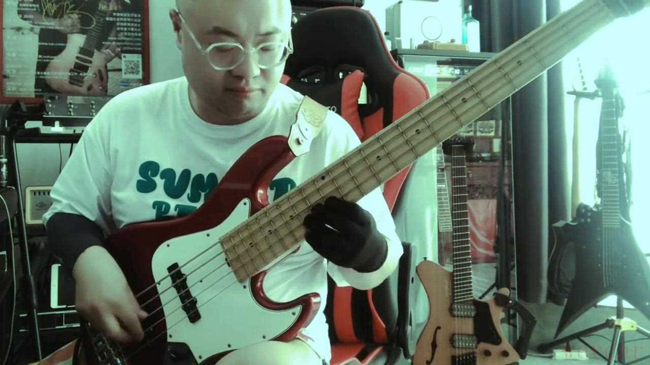 家强演唱会使用的是Warwick的五弦贝斯24品,而且缺角小不影响高把位演奏。这里点弦的动作跟家强一摸一样的,这段solo即好听又很有难度我也是练了很久。这里就有点乱了因为我的贝斯只有21品缺角也很大特别卡手,搞得我手忙脚乱。这里我记得家强歪着头特别沉浸,这连续的五度也的确特别好听。