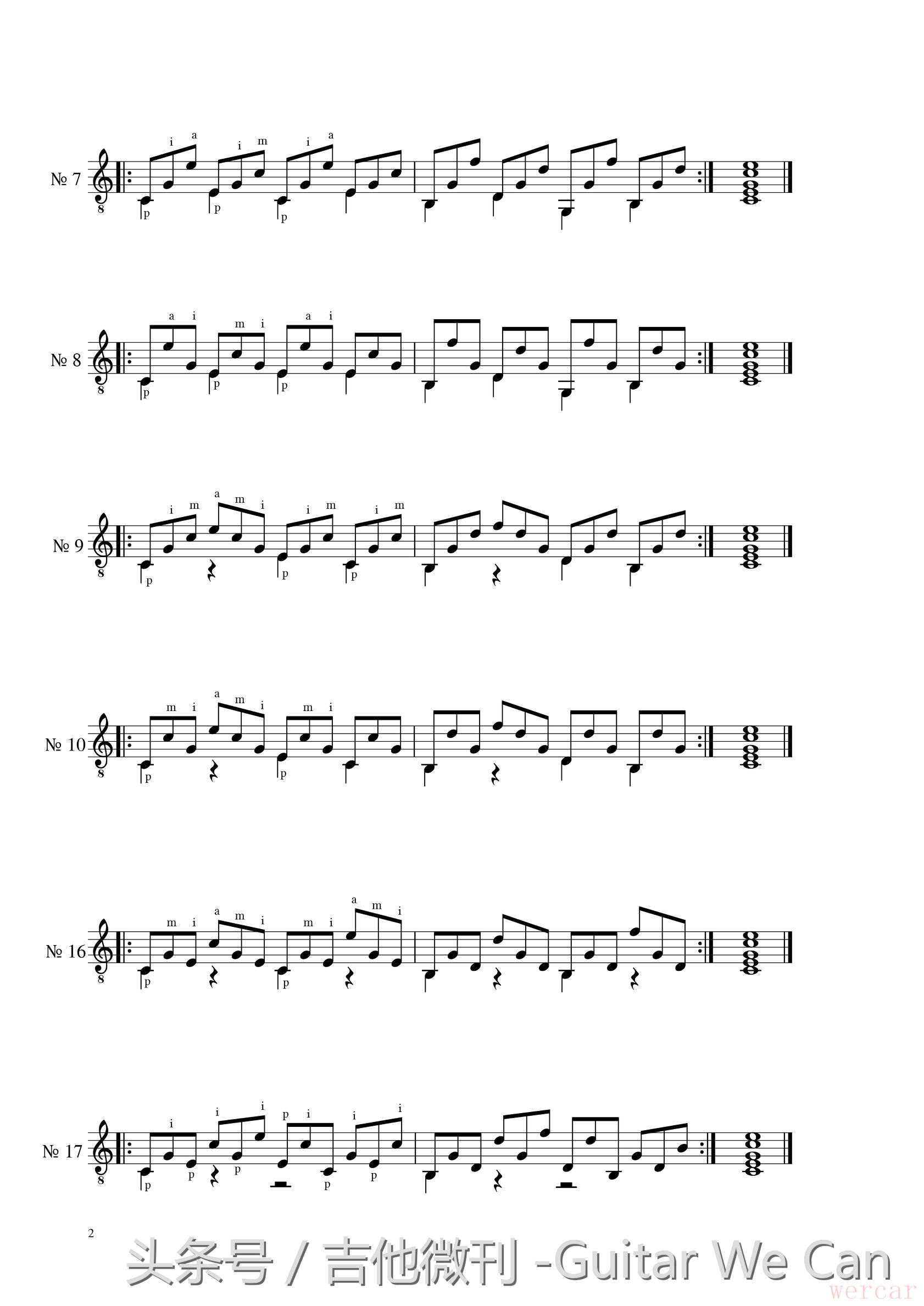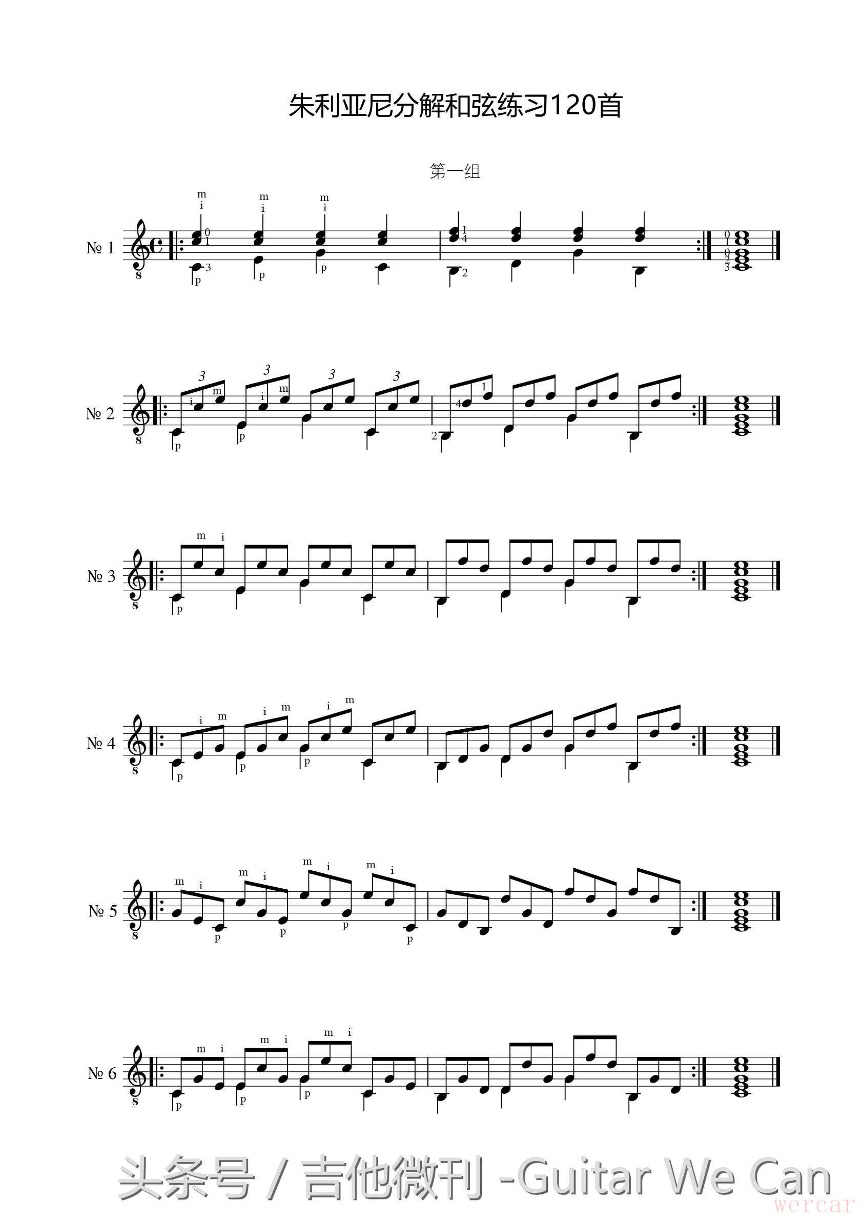 关于古典吉他右手分解和弦的练习有很多,朱利亚尼的《120 条右手练习》是许多演奏家都非常推荐的一套练习曲。在这部作品中,朱利亚尼选择了120种不同的右手分解和弦组合,每种都作为一条独立的练习,共120条,每条练习都只用了两个和弦——C 和 G7。它可以保证我们在没有时间练习其它“高深”的分解和弦练习曲的时候,每天只弹这部作品中,也能保持右手的独立性、稳定性和灵活性。