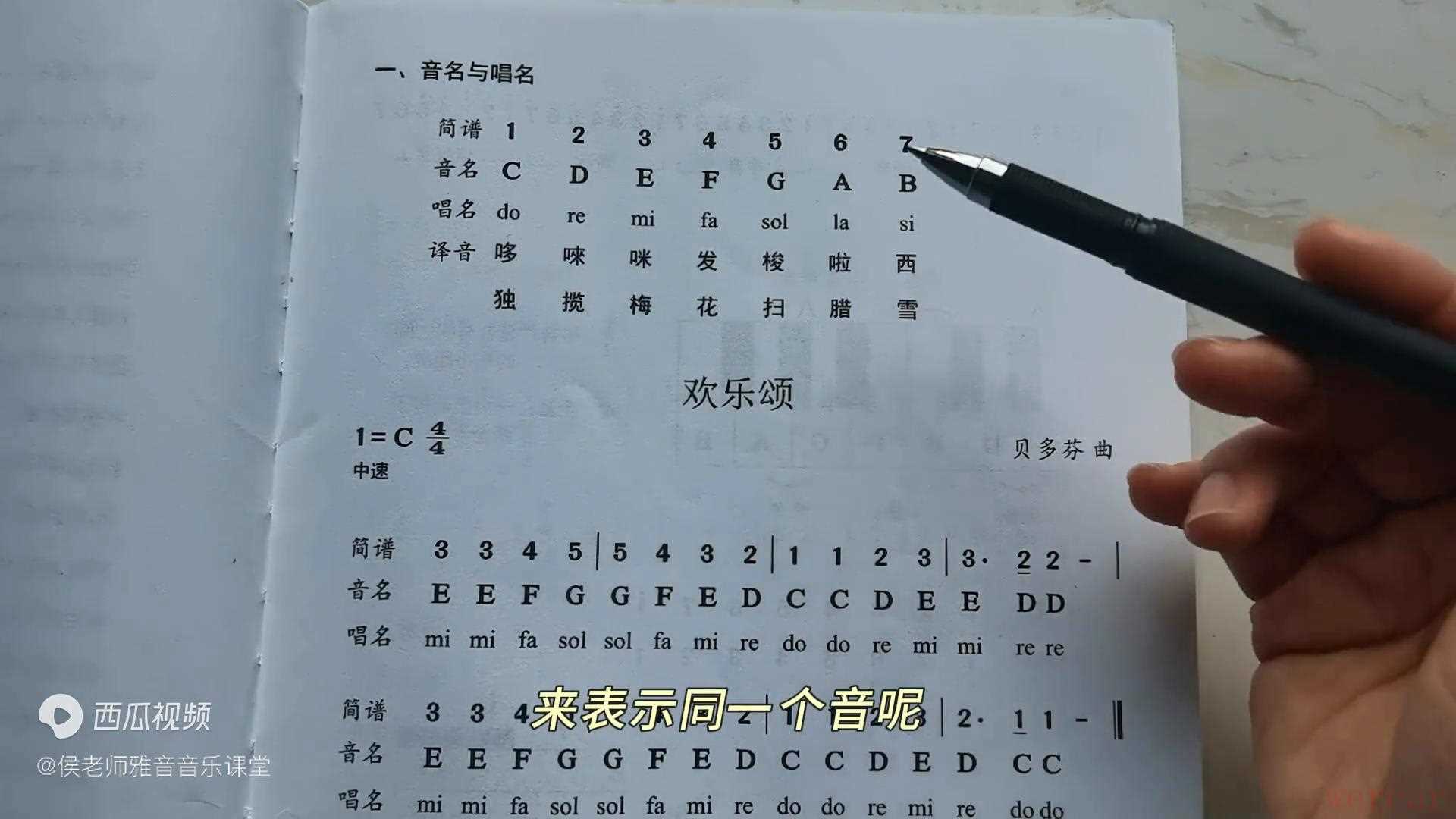 所以来看这个歌例,欢乐颂,看欢乐颂,所以看这个曲子中这记中me right,这个时候这是记法,这是它的官方的音名,唱名是表达唱出来的。