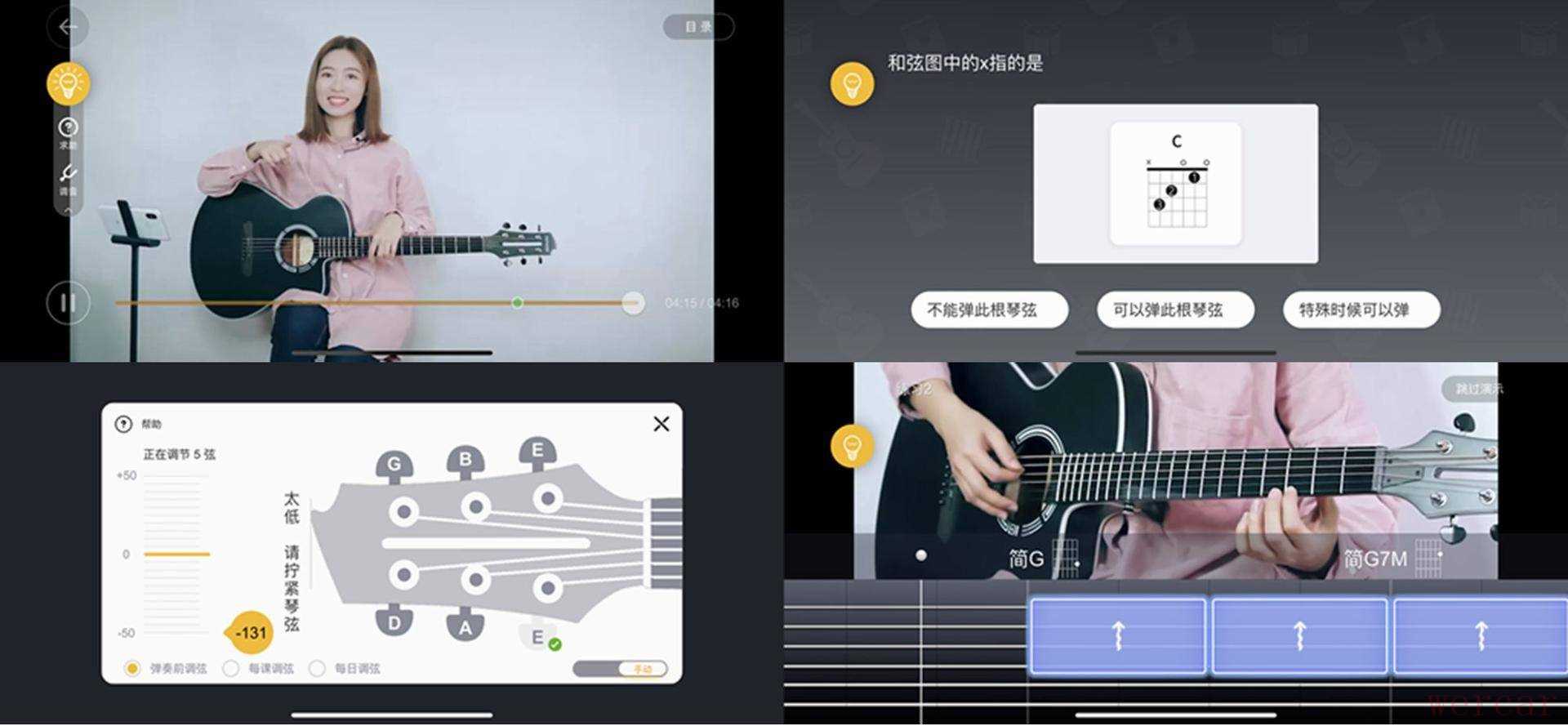 在教程里面,会有小姐姐按照标准的指法弹奏,可以看到包括左手压到几品,右手从几弦开始弹奏,都会非常清晰的展示出来。