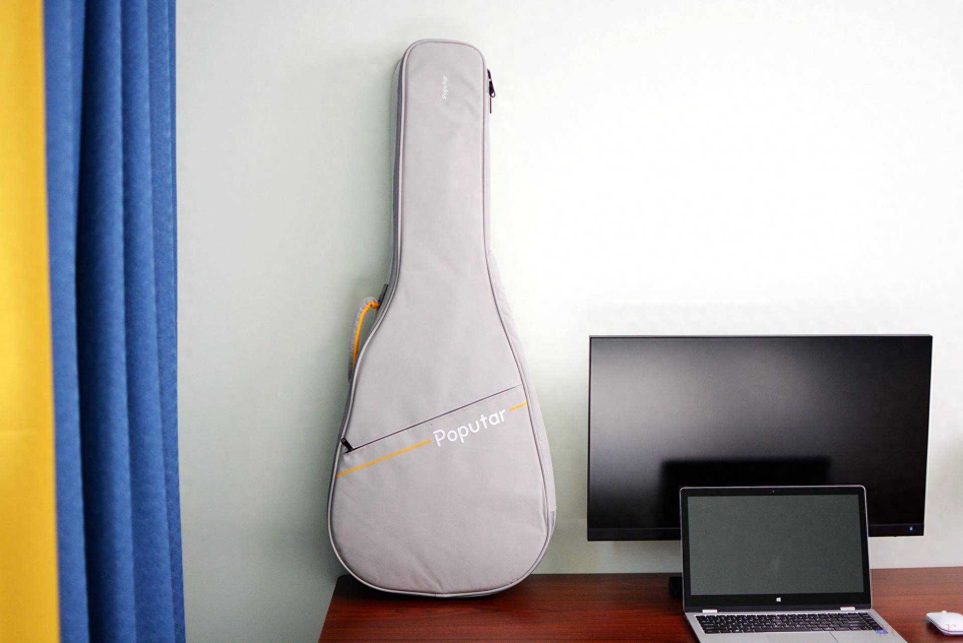 略去包装,Poputar智能吉他卡马联名款(以下简称Poputar智能吉他)附送了一个琴包,浅灰色的琴包看起来比较简洁。