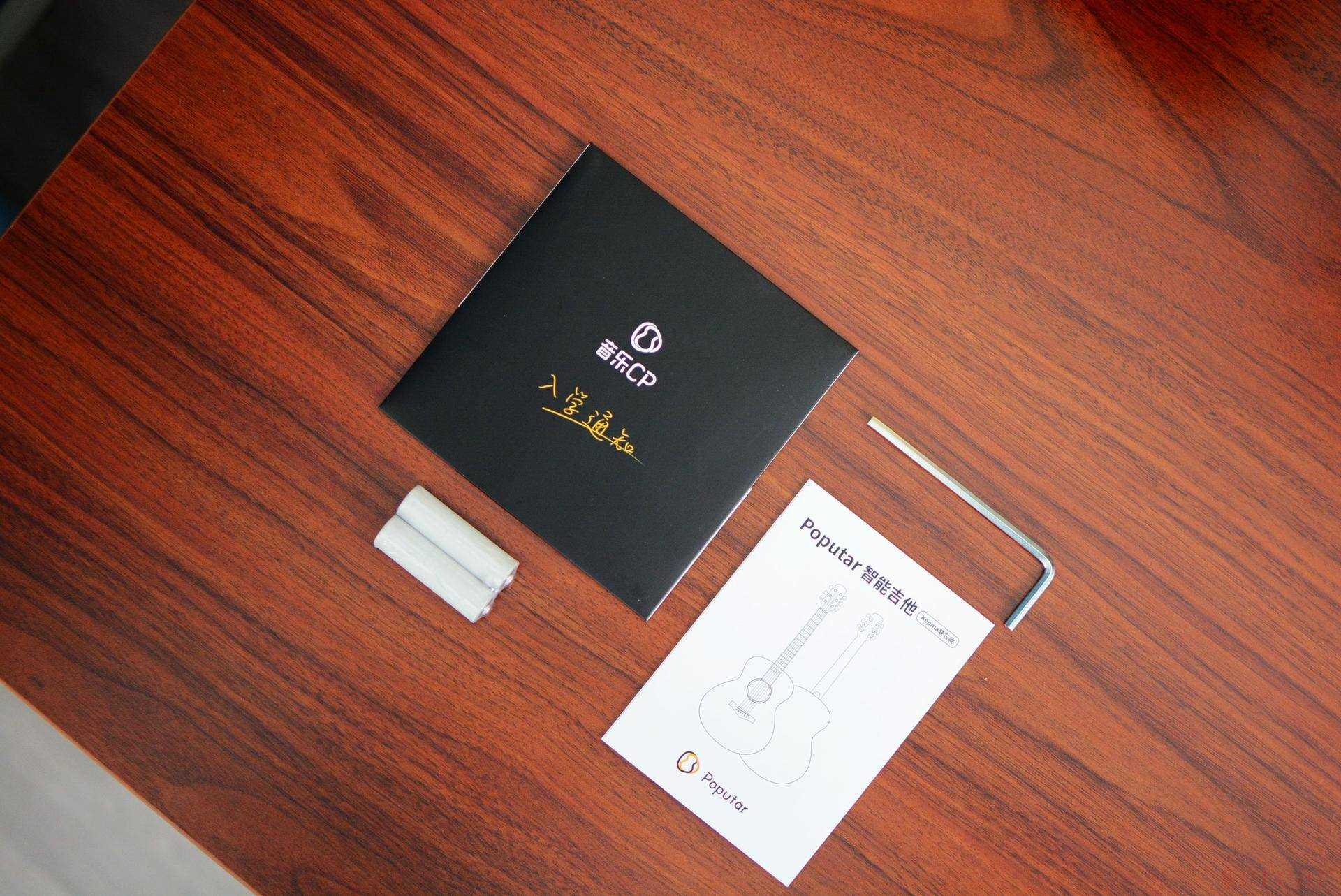 除了常规的说明书之外,Poputar智能吉他还附送了两节干电池、一个内六角工具,以及吉他教程软件。
