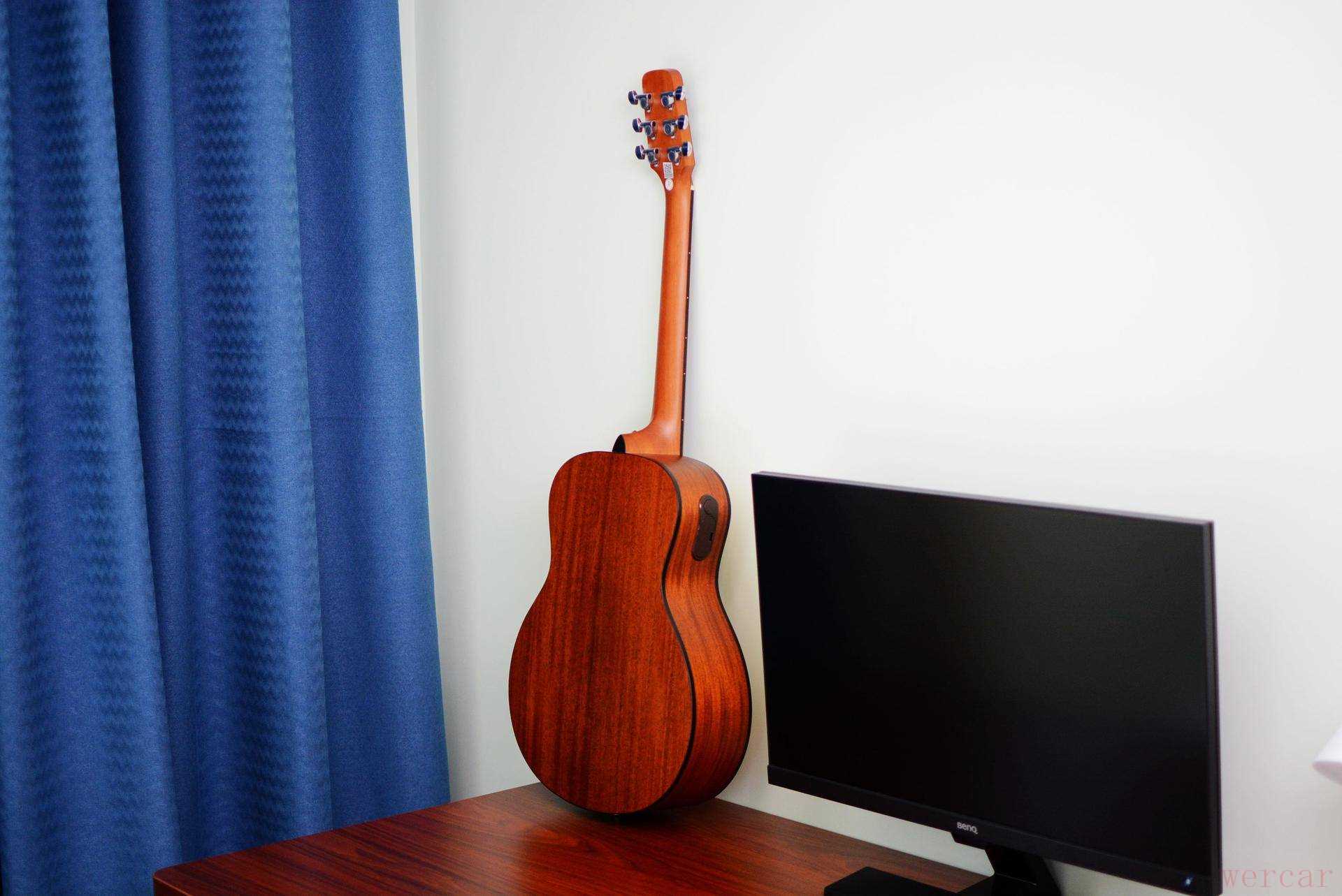 与正面浅色的云杉面板不同,Poputar智能吉他的背侧板,采用了桃花心木,一下就和我的桌子搭配起来了。