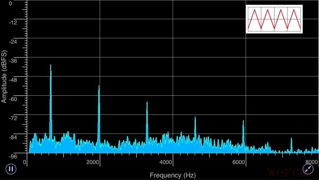 “三角波和正弦波差得不太多,所以新增加的这些峰比基频那个峰矮不少,而且一个比一个矮。”