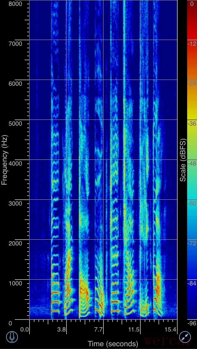电脑把电话内外的声音分析成频谱,显示出了谱图。