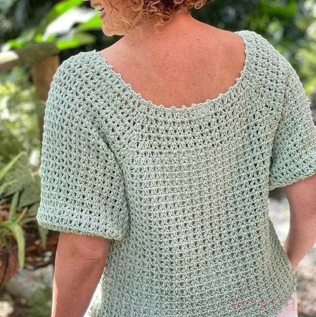 "标题:清爽一夏!钩针浅薄荷绿水草花样短袖,由上往下钩,轻透舒适"