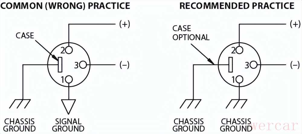 使用XLR型 3针连接器的设备必须将引脚1连接到机箱上(通常称为机箱接地chassis ground)-这并不是我们最常见与认知的音频信号接地。“Not using signal ground isthe most radical departure from common pro-audio practice.”“不使用信号接地是最根本的背离了常见的专业音讯实践。”