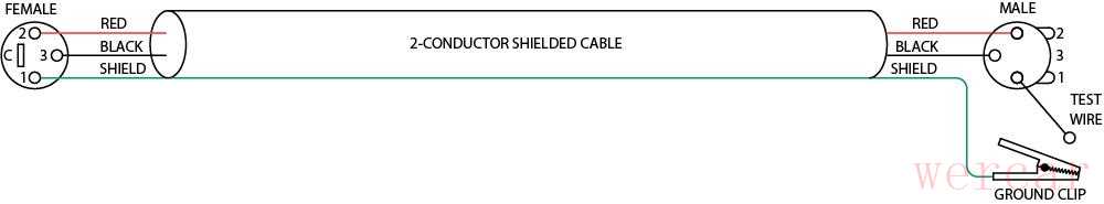 图3.平衡的音频测试电缆(用在对输入端做接地测试)(翻译小编解说:这个方式可能存在安全隐患,如果某些设备保护接地失效在触碰测试线与夹子时两手间可能存在较大电压)