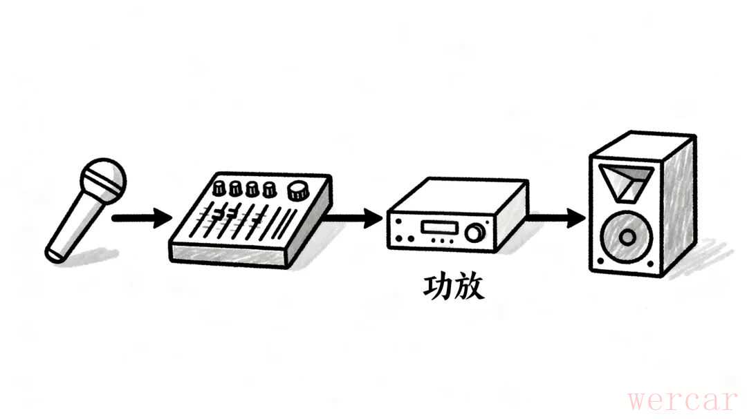 - 放大: 这个声音信号进入调音台和功放,被放大。