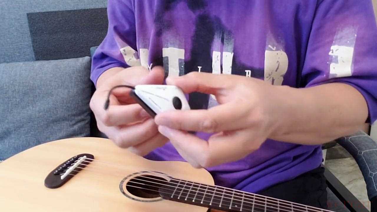 现在用一个吉他里里来测试,粘在这个位置,然后把接收器直接插在音箱上就可以了。插在音箱上以后,距离可以是二十米甚至三十米都可以,音箱放很远都可以听到。