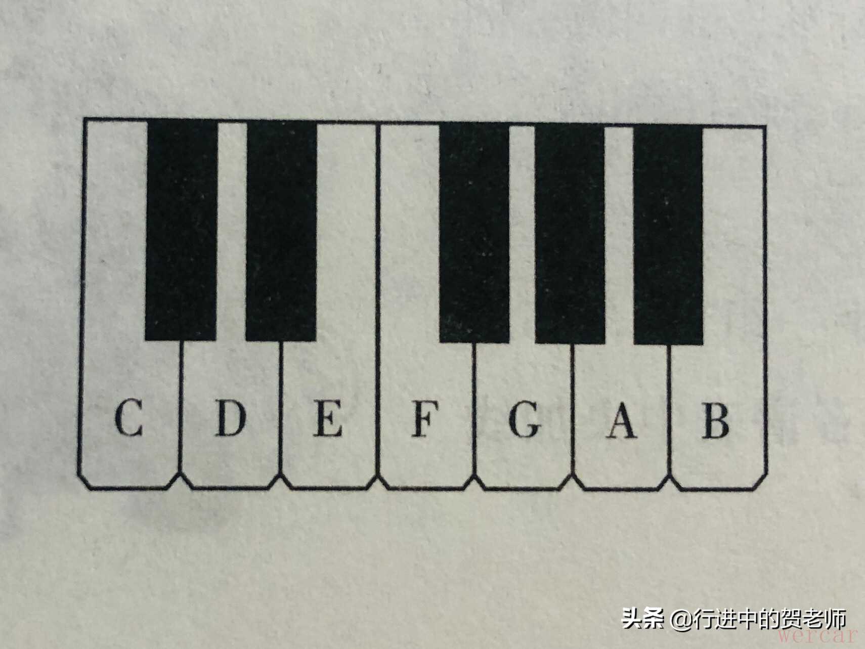 在乐音体系中,由C、D、E、F、G、A、B、7个英文字母命名的音叫做基本音级。如图他们在琴键上面的位置。