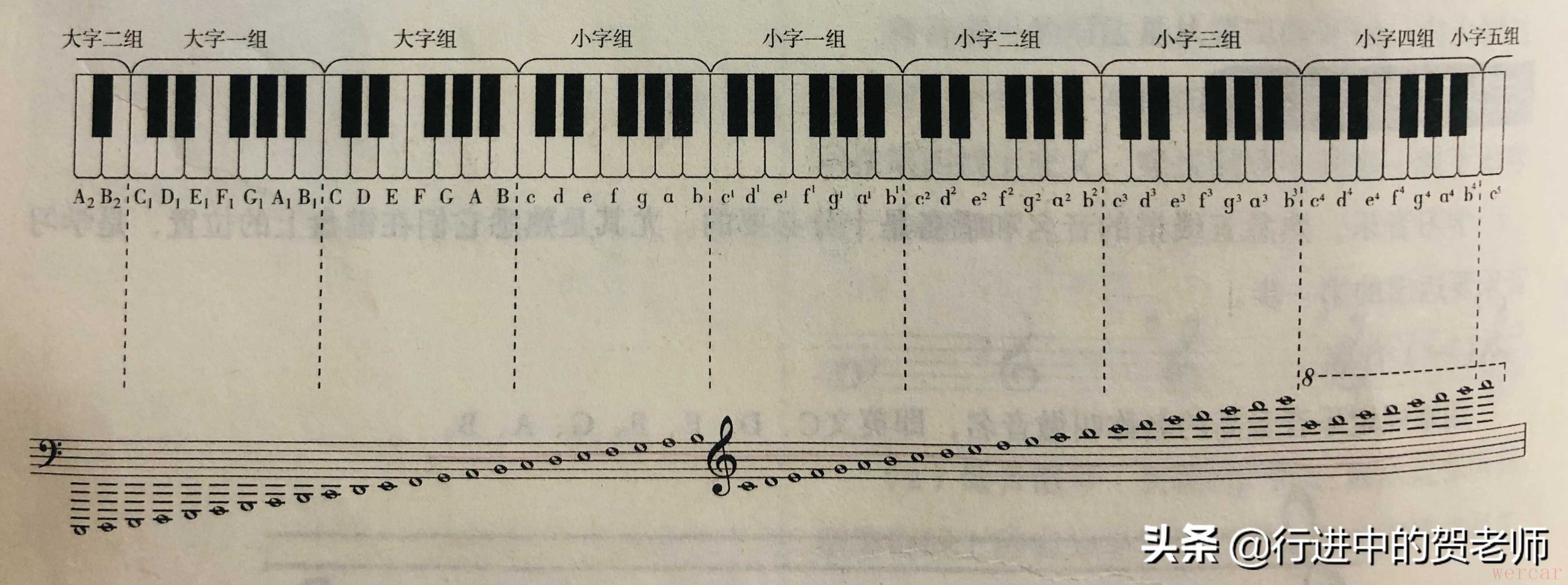我们的音名只有七个,而钢琴却有88个琴键,他们循环使用这一名称,这样就产生了音高不同而音名相同的音,为了区分它们我们将它们进行了分组,一共分为九个音组。如图