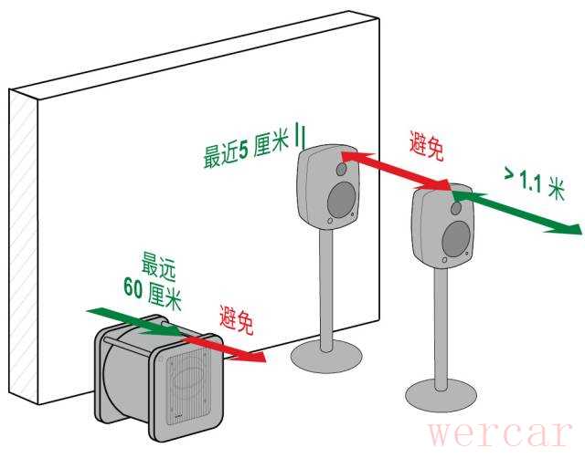 摆放音箱时,应避免墙面、天花板或者地面的反射声到达听音区域,对直达声造成干扰。