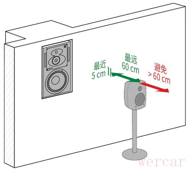 为了避免音箱背后的墙面反射带来的声学抵消问题,请遵循以下原则。音箱后墙的反射只发生在低频频段,这种反射会与直达声相抵消,降低音箱在特定频段的低频响应。要减小这种抵消,需将音箱靠近墙面放置。通常,音箱前表面距离后墙应小于 0.6 米,才能保证低频不被抵消。对于后倒相的音箱,音箱背板需与墙面留出至少 0.05 米的缝隙。