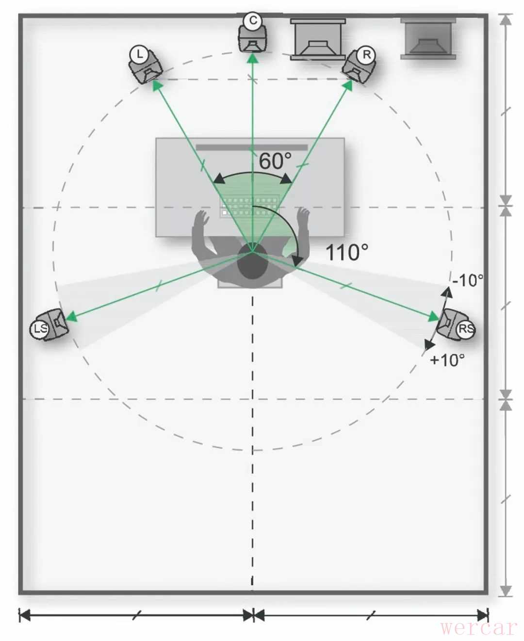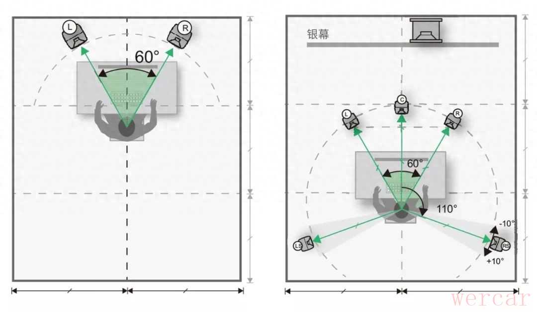 两种不同房间布局中的 5.1 声道监听系统 摆放建议: