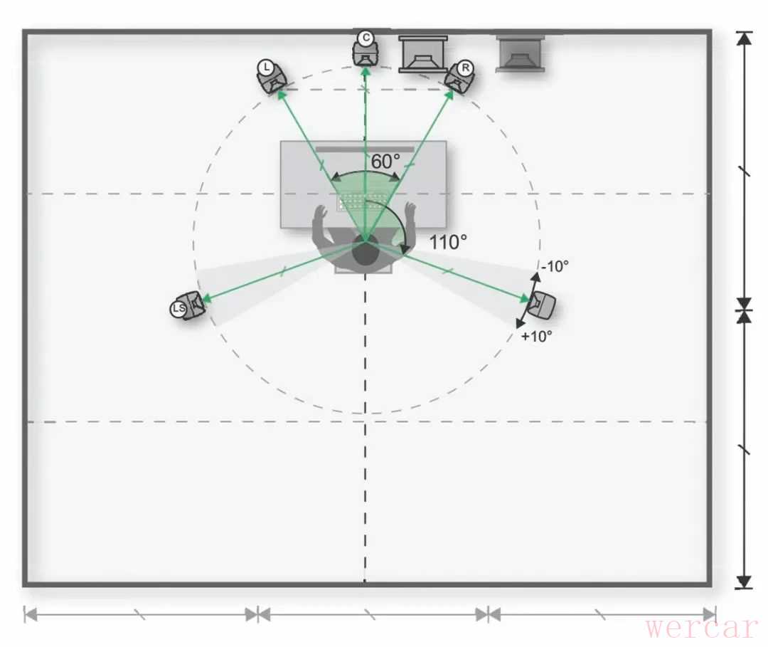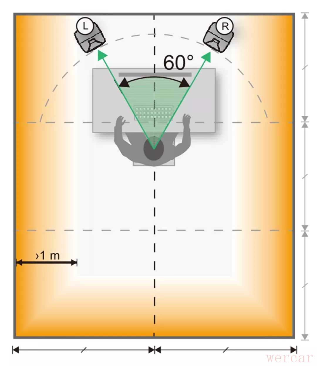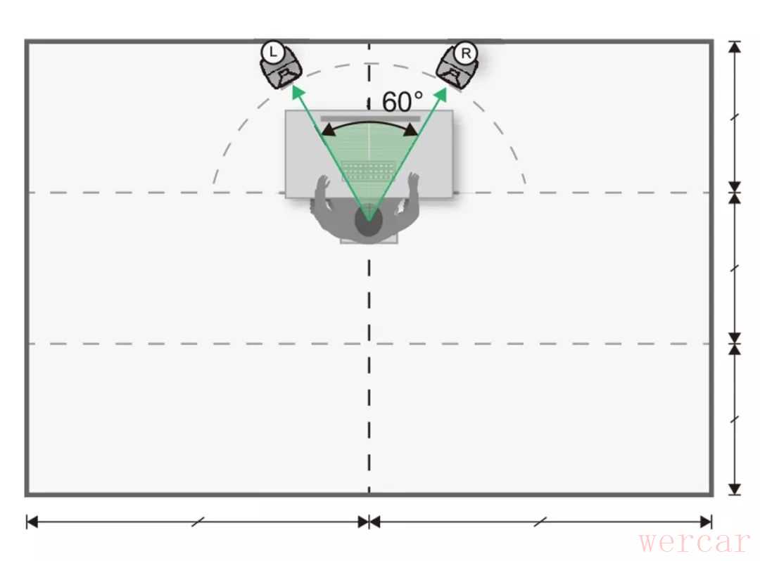 若以音乐制作为用途,请将音箱摆放到前区。将两只监听音箱呈 60 度夹角摆放,并指向听音位置。若以影视制作为用途,请将音箱摆放到后区。