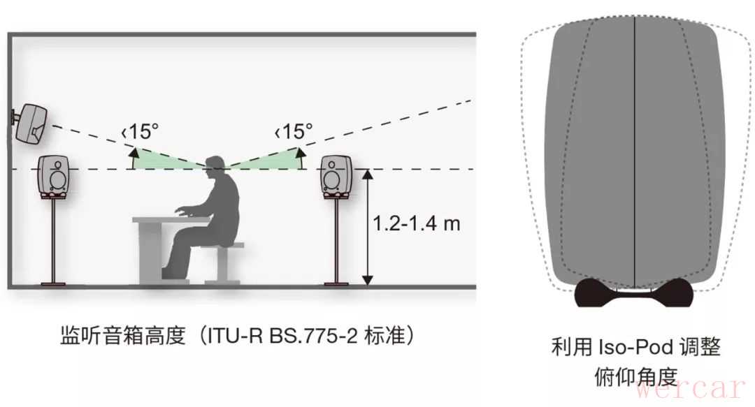 对于典型的二分频监听音箱,音箱声轴高度应与耳朵平齐,通常距地面 1.2 至 1.4 米。将音箱置于更高的位置,并稍向下倾斜,可以减少地面反射的影响。对于标准的立体声和多声道重放,请勿将音箱置于过高的位置上,声轴俯角应小于 15°。音箱需要始终指向听音点。音箱设置的越高,地板反射对于频率响应的影响越小。但需要注意,天花板也会造成低频反射,请勿将音箱置于超过层高一半的高度。